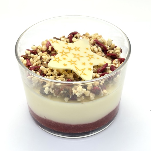 Jordgubbar, socker, pektin, citron, gelatin, champagne, MASCARPONE, ÄGG, GRÄDDE, frystorkade hallon, krokella (puffat ris), SMÖR, vit choklad, potatismjöl, salt.