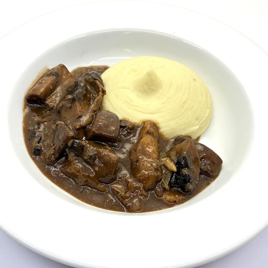 ”SVAMBOURGUIGNON”: Portabellosvamp, skogschampinjoner, torkad Karljohansvamp, rödvin, morötter, palsternacka, gul lök, tomatpuré, vitlök, balsamvinäger, torkad timjan, lagerblad, råsocker, glutenfri soja (vatten, sojabönor, salt, ättika), salt, svartpeppar. TRYFFELPOTATISPURÉ: Potatis, MJÖLK (lakosfri), GRÄDDE (laktosfri), SMÖR (laktosfri), rapsolja, salt, sommartryffel, tryffelolja, peppar.