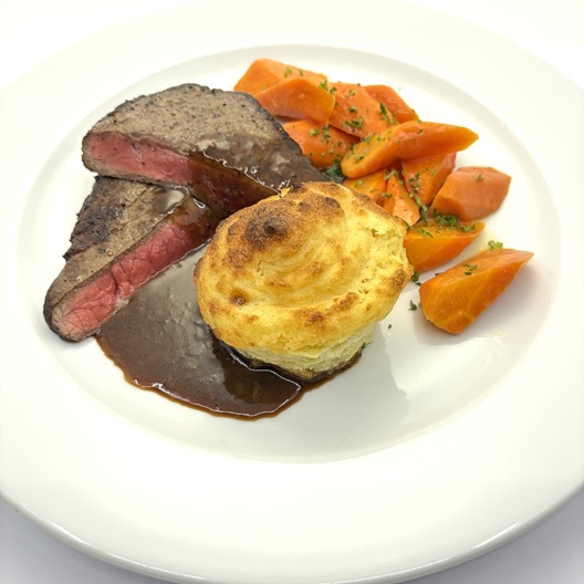 Inför förrätten behöver purén värmas och pilgrimsmusslan stekas enligt instruktion. Inför varmrätten behöver köttet stekas och gå klart i ugn och övriga tillbehör värms enligt instruktion. Desserten är helt färdig. Ha en stektermometer till förfogande för bästa resultat samt olja, smör, salt & peppar till stekning.